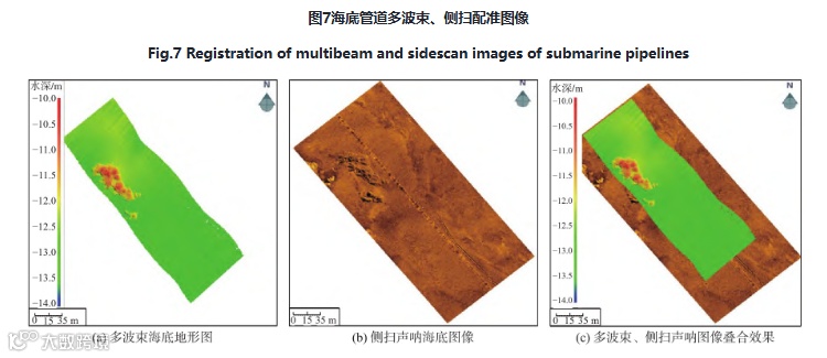 为了检验该系统的多波束海底地形图和侧扫声呐海底地貌图的图像配准效果,对同一测线位置处多波束海底地形图(图7a)、侧扫声呐海底图像(图7b)进行合处理,可以发现海底裸露管道在多波束海底地形和侧扫声呐海底图像位置完全重合,配准精度高(图7c)。相较于传统拖电式侧扫声呐定位精度低、与多波束地形图配准难的问题,该系统高精度配准的多波束地形和侧扫声呐图像有利于海底管道埋藏状态的特征提取和目标定位解释等工作。