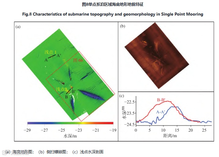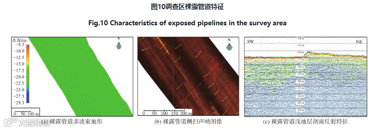 受海底地形、动力条件等复杂海洋环境因素影响,海底管道常因局部海床冲中淤而出现裸露、悬空等问题,为保障海底管道运维安全,海底管道县空治理常采用人工水草、沉排、碎石回填等措施,根据调查区的多波束水深地形(图10a)和侧扫声呐图像(图10b),结合Innomar SES 2000浅地层剖面系统探测结果(图10c),可对调査区内裸露海底营道堙藏状态进行准确识别分析。通过对裸露段管道的特征统计,发现调查区内近岸区海底管道出露程度较为严重,随着向离岸方向水深逐渐加深,管道裸露现象减少,呈现出自登陆点向单点系泊方向管道裸露程度逐渐降低的总体趋势。