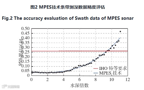 水深测量精度是测深侧扫声呐重点关注的问题,有关学者通过实验数据与参考数据对比,对MPES技术测深精度进行了评估。图2为10 m水深条件下水深总垂直不确定度(TVU)95%置信区间与水深的函数关系,图中黑点及其蓝色拟合线代表不同水深倍数条件下水深总垂直不确定度(TVU)95%的置信区间,红色水平直线代表国际水文测量组织(IHO)特级测量标准的总垂直不确定度。由图2可以看出,MPES技术在9.5倍水深范围内符合IHO特级标准,与传统多波束测深声呐相比,以MPES技术为基础的测深侧扫声呐能够在更宽的愛盖范围内满足水深调査标准规范要求,可有效减少调査区域内的扫测次数,减少数据采集时间和成本,提高调査效率。