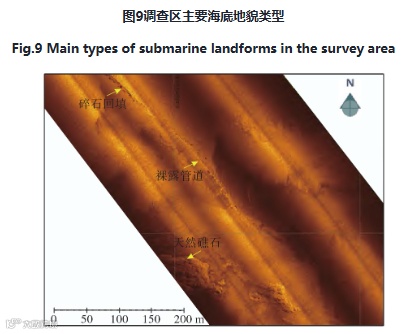 统计发现,调查区内多数路段管道两侧裸露程度不同,管道东北侧裸露程度明显低于管道西南侧(图10c)。初步分析认为,这种情况可能是由该区海流流向决定的,调查区潮流观测结果表明该区主要流向为E一W向、NE-SW向(图5d),常年主流向为NE-SW向。在该方向海流作用下,管道向流侧(即东北侧)形成堆积,管道背流侧(即西南侧)发生冲中刷侵蚀,逐渐形成了管道两侧东北高、西南低的地形形态。这种情况如进一步发展,有可能会造成海底管道裸露情况加重甚至悬空,从而危及海底管道安全。