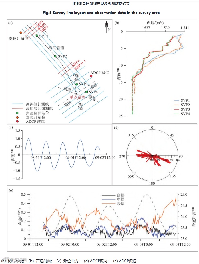 调查作业开始前,为满足多波束和侧扫声呐全覆盖测量要求,根据设备性能指标和作业海域现状,在Hypack软件中进行测线布设,平行海管方向布设测深侧扫测线,垂直海管方向布设浅地层剖面测线,在单点系泊管汇重点关注区域,布设加密测线。多波束测深原始数据必须经过声速改正、潮位改正等关键处理步骤,才能最终生成准确可靠的水深测量成果,为此,合理设计选择站位进行了声速剖面测量、验潮工作(图5a)。