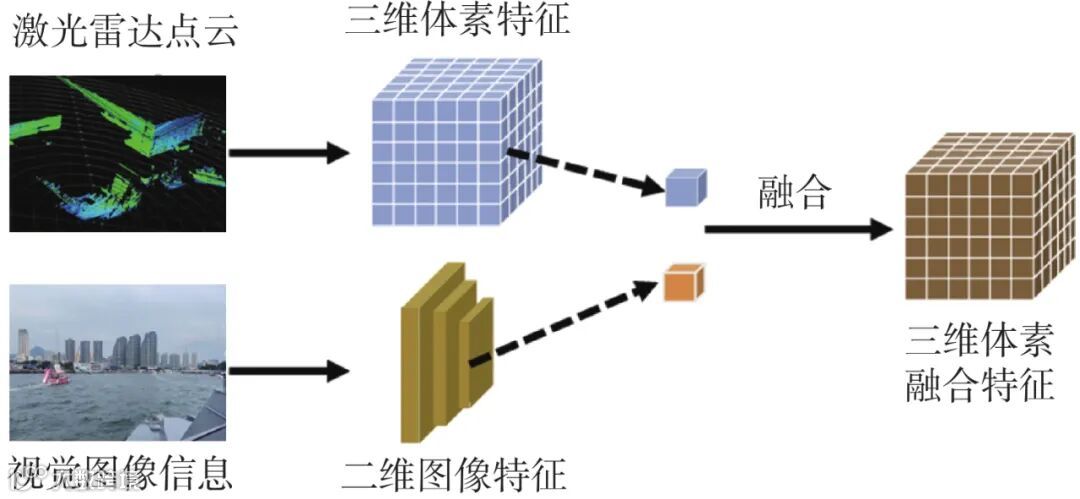 然而,目标级融合对传感器的独立性要求较高,需要单个感知模块能独立输出准确的结果,设置采信依据,难以处理传感器之间冲突的检测结果;另外,直接使用各传感器给出的目标信息输出可能导致关键信息丢失,降低整体融合精度。针对上述问题,目前的多源信息融合算法逐渐往特征级融合发展。特征级融合又称中间融合,是指在各类传感器原始数据层面对多模态数据进行融合。针对多传感器原始的多模态数据,使用特征提取器分别获取多种传感器的嵌入表示,再使用下游模块融合2种模态的特征,其原理如图2所示。特征融合技术可以结合来自不同传感器的数据,增强目标特征表达,有效提升无人艇在复杂海洋环境下目标识别与跟踪的效果。例如,Zhang等[17]使用点云来支持图像检测,从距离像和距离多普勒谱图中提取多层次快时间特征和距离特征,提取的多种互补性特征增加了目标和杂波之间的差异性;Kim等[18]通过雷达引导的BEV(bird's-eye-view)编码器将相机特征转换为精确的BEV表示,并结合雷达和相机的BEV特征,利用雷达提供的测距信息更准确地定位物体。贺治卜等[19]提出一种融合激光雷达和惯性导航系统的靠离泊高精度定位方法,引入泊位高程来确定聚类阈值,减小因点云数据的随机性而产生的对岸线检测精度的影响。相较于目标级融合,特征级融合能充分挖掘各传感器原始数据中的丰富信息,同时也对算力提出了更高的要求。