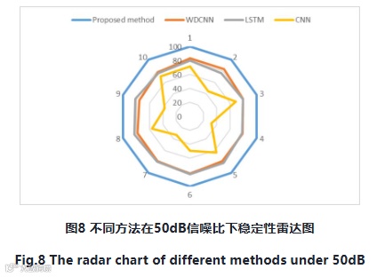 稳定性性能分析:进行多次实验以确认所建模型的稳定性:图8显示了每种模型在50dB信噪比下的多次实验的稳定性雷达图。由此可知,所提出的方法在众多实验中取得了最稳定的结果,并且误差最小。具体来说,所述方法的平均准确率为99.66%,使平均准确率提高了20,29%。与WDCNN方法和CNN方法相比,准确率分别提高了20.69%和47.25%。这进一步意味着所提方法具有更强的抗干扰能力。