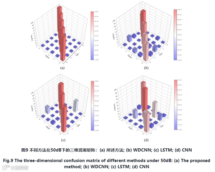 分类精度分析:图9显示了50dB信噪比下各种方法的三维混淆矩阵。通过混淆矩阵,可以清楚地看到每种故障的分类准确性和误分类准确性。其中,主矩阵对角线对应每种故障的分类精度,而主对角线的两侧对应每种故障的误分类精度,混淆矩阵中的颜色深度对应于图右侧的精确颜色条,可以更直观地反映分类精度。基于图9所示的结果,所提出的方法在分类准准确性和误分类方面都表现出了出色的有效性。