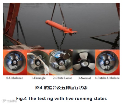 在放置在静态水箱中的AUV推进器上安装振动传感器进行信号采集,DH5902N型数据采集系统用于存储这些振动信号。数据采样参数设置如下:推进器转速为3000r/min,采样频率设置为12800Hz,采样长度设置为10s。模拟5种运行状态(不平衡-Unbalance、缠绕-Entangle、溜槽松动-Chute Loose、正常-Normal和双叶不平衡-futaba Unbalance),并收集了相应的信号。实验平台如图4所示,其中标签0-4分别对应不平衡、缠绕、溜槽松动、正常和双叶不平衡五种运行状态。需要注意的是,不平衡(图4中记为0)是通过在叶片上系一根绳子带来模拟的,双叶不平衡(在图4中标记为4)是通过分别在两个叶片上系两根绳子带来仿真的。