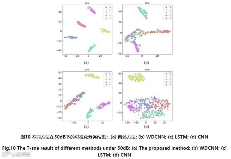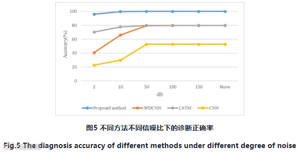 抗干扰能力分析:将所提出的混合模型的分析结果分别与WDCNN、LSTM和CNN进行比较,以验证其优势。WDCNN是一种经典的深度卷积神经网络模型,其特点是使用宽核设计,可以有效地掌握输入信号的全局特征。此外,WDCNN还具有良好的噪声抑制能力,在处理噪声数据时可以保持高精度和鲁棒性。此外,将收集到的未处理的振动数据用作输入。训练数据集和测试数据集被随机划分,共获得1380个训练样本和590个测试样本。应该指出的是,对所有四种方法进行了10次实验,以消除偶然误差。图5显示了六种不同信噪比水平下每个模型的实验结果。通过比较,可以发现所提出的方法取得了最佳结果:在没有噪声影响或信噪比相对较高,即150dB时,所提出方法的诊断精度能够获得高分。当信噪比极小,即2dB时,所提出方法的诊断精度仍可达95.96%。在上述两种极端信噪比方面,所提出的方法的结果均优于其它三种方法,验证了所提出的办法具有良好的干扰抑制能力。
