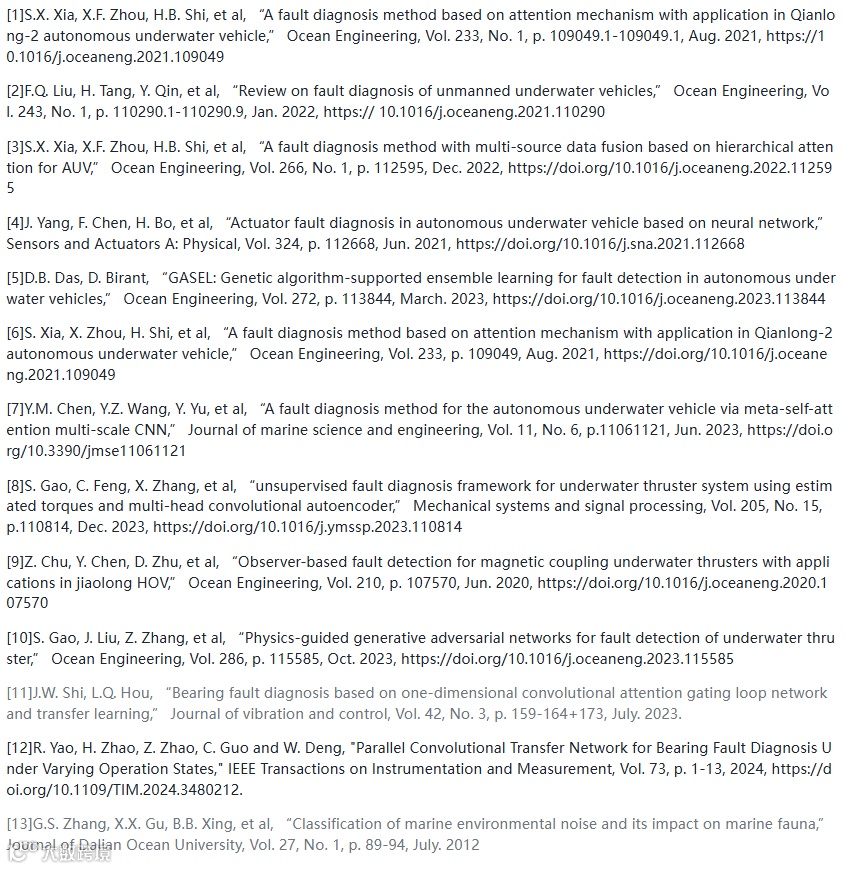 目前,AUV故障检测主要有两种方法:面向模型和基于数据驱动。前者通常依赖于人类经验和专家知识,另由于AUV现实操作环境的复杂性,为AUV开发准确的数学模型具有挑战性。相比之下,基于数据驱动的方法不需要预先建模可以通过学习和分析大量实际数据来提取故障特征,这对于AUV故障诊断的实际工程应用来说更加灵活可行。近年来,AUV出现了各种数据驱动的故障诊断方法。为了充分利用多源信息进行AUV故障诊断,Xia等提出一种有效基础编码-解码网络、注意力机制及多源数据融合的诊断方法:Yang等将宽卷积神经网络与极限学习机集成用于AUV故障诊断,其具有不依赖于域自适应算法或需要目标域信息的优点,Das等提出一种基于遗传算法与极限机器学习的AUV在线故障检测方法,Xia等将双向门控递归神经单元与多层感知网络结合,提出一种用于AUV推进器故障诊断的多尺度卷积神经网络模型,Chen等提出一种称为元自关注的多尺度卷积神经网络模型,其将振动信号的二维频谱作为模型输入成功用于AUV故障诊断,Gao等设计一种多头卷积自编码器,并利用估计扭矩作为模型的输入实现AUV推进器的无监督诊断:Chu等设计一种終端滑模观测器増强RNN的AUV推进器故障诊断方法:Gao等提出一种融合物理模型与生成对抗网络的AUV推进器故障诊断组合框架。