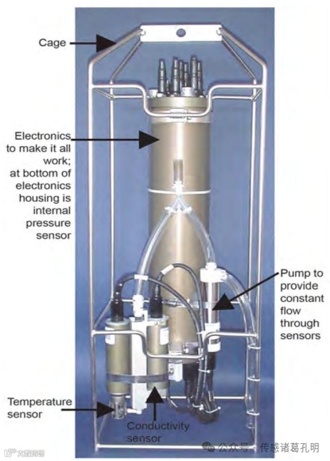 如果我们测量电导率、温度和压力,就可以计算出水中溶解盐的含量,即盐度。盐度的单位是PSU;海洋中的典型盐度值为35 PSU。一旦知道盐度,我们就可以计算出许多其他参数,如密度和声速。因此,电导率被认为是海洋探测的基本参数。CTD这个术语通常用于描述一个组合装置,它不仅包括实际的CTD,还包括用于测量其他参数的辅助传感器(如溶解氧、pH 值、浊度、荧光、油类、光合有效辐射、硝酸盐、高度计等)。