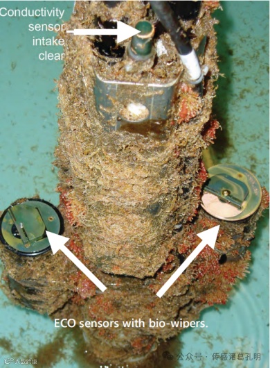 由于系泊型CTD长时间放置在原地,它们会受到生物污损,海洋生物在传感器内外生长,如上图所示。生物污损在温暖的表层水域更为严重。系泊型CTD使用环保署批准的防污装置来保持传感器内部清洁,使污损不会影响测量结果。对于辅助光学传感器,有效的防污技术包括使用铜以及在每次采样前使用擦拭器清洁光学部件。