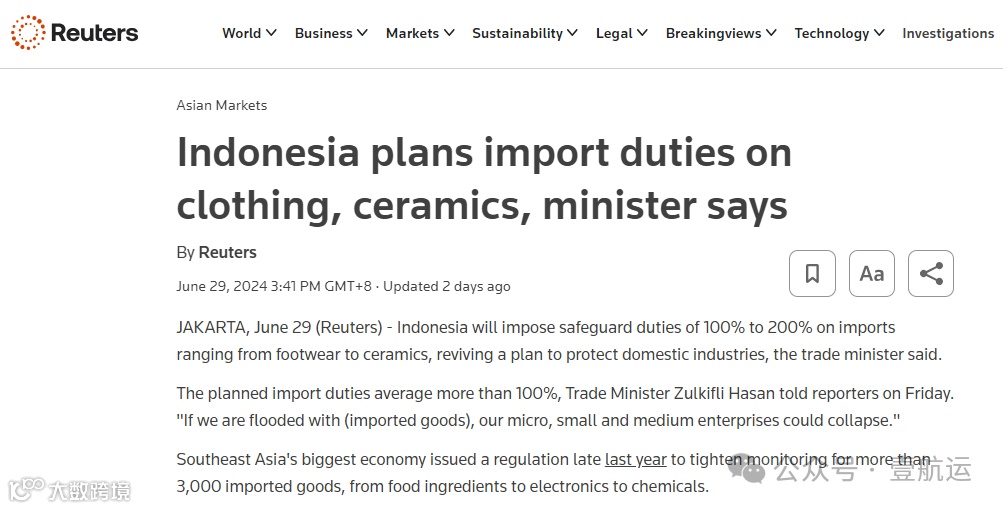 另据路透社报道,Zulkifli Hasan在公开场合表示,印尼将对鞋类、服装、纺织品、化妆品和陶瓷等进口产品征收100%至200%的保障性关税,以重启并加强对国内产业的保护措施。