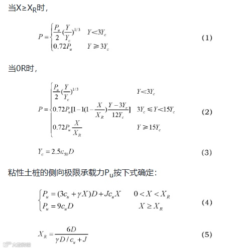 式中,Pu为深度X处单位桩长的极限水平土抗力标准值(kN/m);cu为未受扰动粘土土样的不排水抗剪强度(kPa);D为桩的外直径(m);y为土的有效重度(kN/m3);为无量纲经验常数,变化范围为0.25~0.5;X为泥面下计算点的深度(m);XR,为泥面以下到土抗力减小区域底部的深度(m);D为桩的外直径(m);ε5o为三轴试验中最大主应力差一半时的应变值;P为深度X处单位桩长的水平土抗力标准值(kN/m);Y为泥面以下X深度处桩的侧向水平变形(m)。