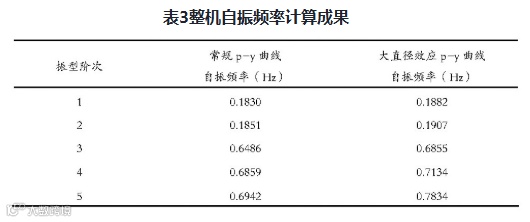 根据计算结果,两种p-y曲线计算的振型基本一致,一二阶为平动,三至五阶为转动,如图6所示。模态结果有所差别,如表3所示,从计算结果可以看出粘性土p-y曲线考虑大直径效应后,风电机组模态计算结果明显大于采用常规p-y曲线的计算结果。这表明,考虑大直径效应后,地基土的水平刚度得到了提升,若两种p-y曲线计算一阶频率一样的情况下,考虑大直径桩效应后,可节省用钢量约70t左右。