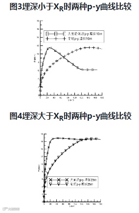 粘性土p-y曲线,在相同水平变形y值的条件下,单位桩长的极限水平土抗力P值,随着土层埋深增大而增大,且曲线峰值后的下降段随着埋深增大逐渐平缓。