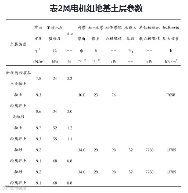 根据海洋水文条件,风电场多年平均海平面高度0.12m,最大水深约为14.0m。设计高水位和设计低水位分别为2.76和-2.26m,50年一遇极端高水位和极端低水位分别为3.26和-3.10m。50年一遇的H1%波高为9.39m,对应周期为18.9s,波浪的主浪向为ENE,海水表面流速为2.81m/s,底部流速为1.54m/s。地基土层以粘性土和砂性土为主,参数如表2所示。