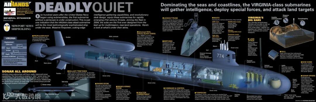 当然关于弗吉尼亚核潜艇细节,还有很多,今天先到此为止,将来有机会再继续。客观来说,弗吉尼亚核潜艇的任务多元性还是可以的,背后有信息体系支持,对陆打击能力最强,同时它还拥有出色的隐身性能和强大的战斗能力,当然真的能否展现,关联很多因素,具体就不展开了,弗吉尼亚核潜艇还保留了近海作战能力,是目前最为先进的攻击核潜艇之一。