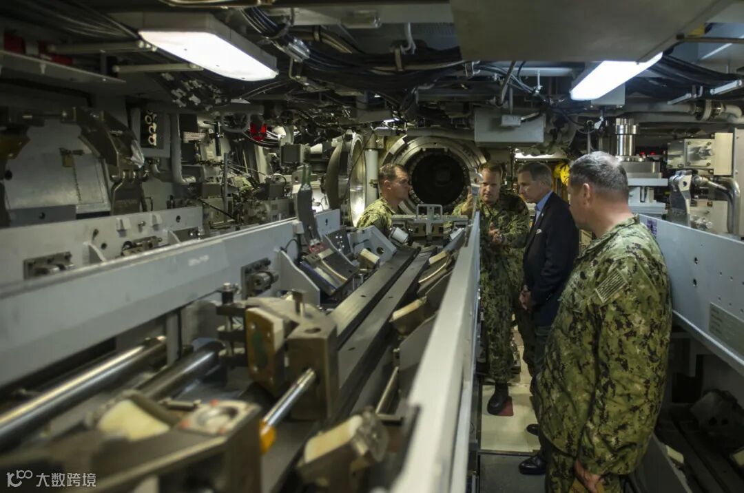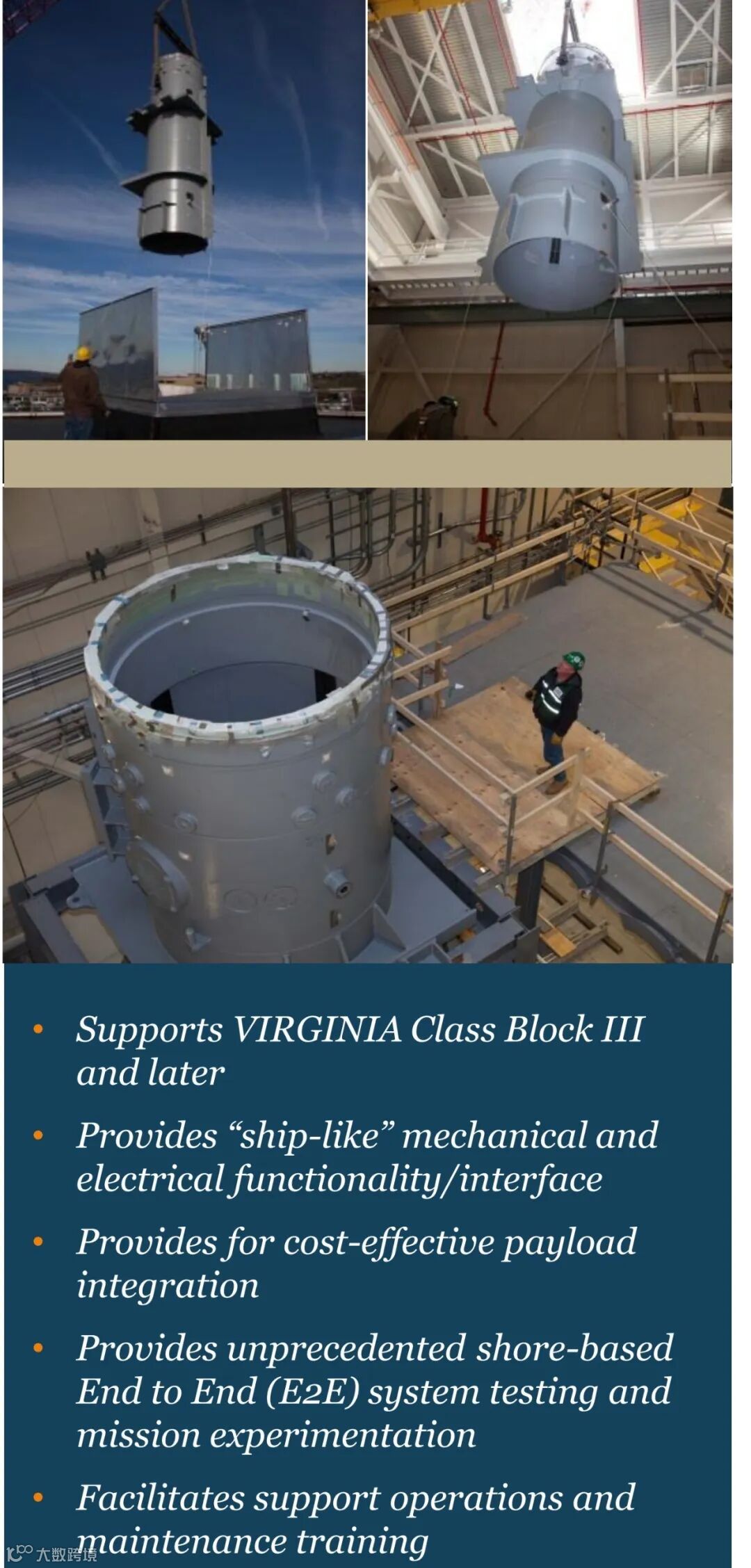 “弗吉尼亚”级Block 3型核潜艇,“约翰·沃纳” SSN-785 潜艇前部的“有效载荷发射管” VPT ,有点意思,每个VPT可以携带6枚“战斧”巡航导弹,看着像是7个,不过中间那个是检修舱口,Block 3/4型有两个VPT,前十艘“弗吉尼亚”Block 1/2型依然采用的是老款,VPT的技术来自“俄亥俄”级巡航导弹核潜艇,不过由于“弗吉尼亚”的耐压壳直径比“俄亥俄”更小,因此其发射装置比“俄亥俄”的更短更宽,VPT比MK45成本更低,其更大的直径使其还能携带更大尺寸的载荷,另外两图分别为装填“战斧”巡航导弹和鱼雷舱。