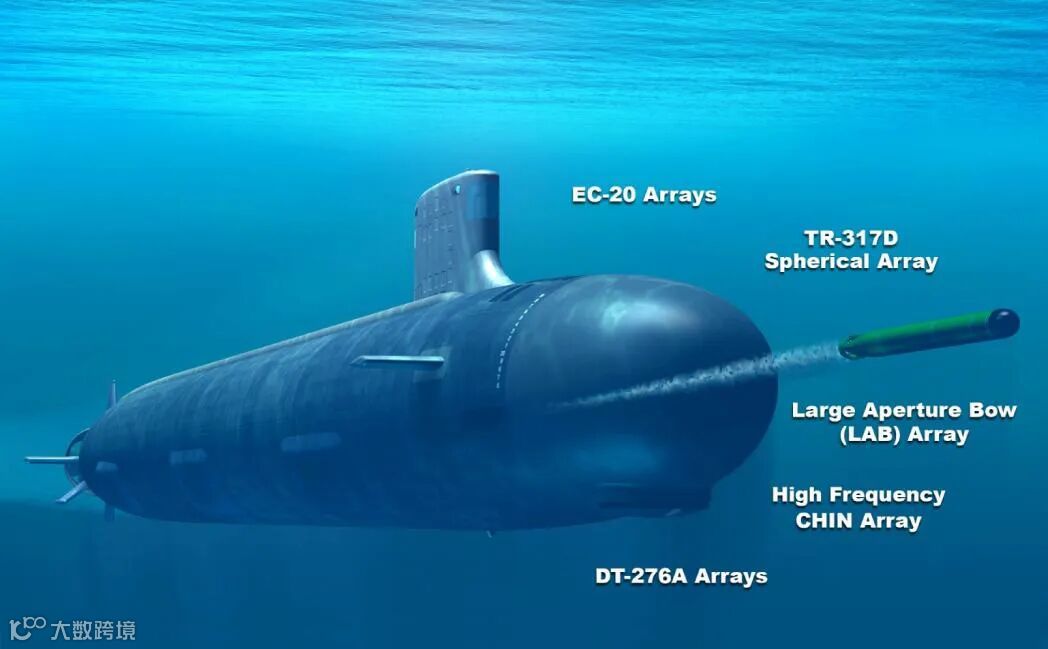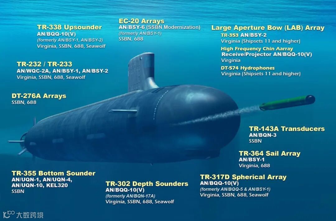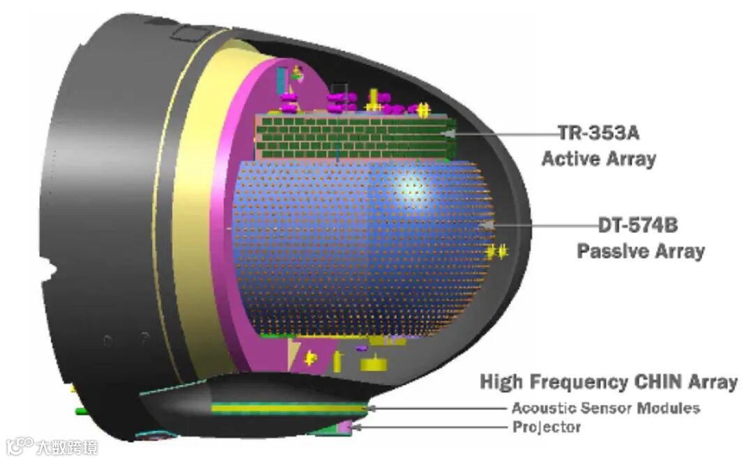 首先看看美国海军大洋利刃”弗吉尼亚“级Block III型核动力攻击型潜艇,其新型大孔径艏阵(LAB,Large Aperture Bow)声纳中使用的DT-574B水听器和TR-353A换能器,LAB声呐阵列取代了TR-317D有源/无源球形阵列,LAB包含1822个DT-574B水听器的被动阵列,以及包含188个TR-353A换能器的有源阵列。其中一图为”弗吉尼亚“级Block I/II和,接着那一图就是“已变形”那图,为”洛杉矶“级使用的TR-317有源/无源球形阵列,供参考对比,后面是安装橡胶窗之前的高频下巴阵列(HFCA,水雷探测声纳)的声音发射器。当面这么设计好处,不言而喻,主要得益于潜艇鱼雷管的布置。