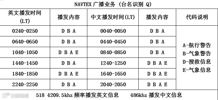 NAVTEX系统(安全信息播发系统),也叫奈伏泰斯系统,国际工作频率统一为518KHz,国内工作频率490KHz/4209.5KHz,或主管机构指定。我国国内指定频率为为486KHz。就像是船舶的专属“天气预报员”,用英语定时向400海里范围以内沿岸的信息,为船舶提供重要的海事安全信息,包括天气预报、航行警告等。