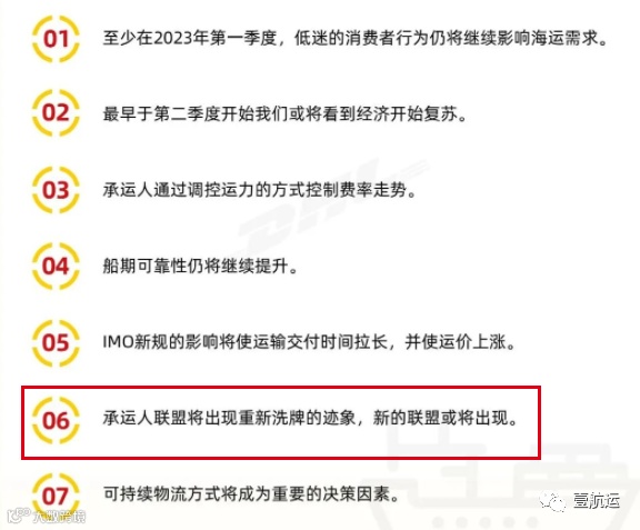 早在1月19日,壹航运就曾为业界朋友带来一份DHL和德迅关于海运2023市场发展的预测报告,当时DHL在报告中指出“承运人联盟将重新出现洗牌的迹象,新的联盟或将出现”;