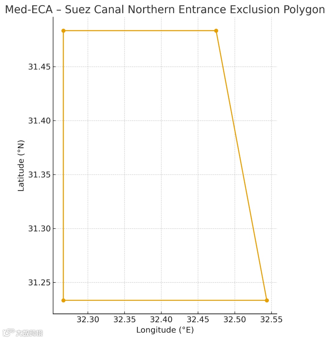该 Med-ECA 把北侧到达苏伊士运河北口,即northern entrance to the Suez Canal 作为边界,但同时排除了一个由 4 个点连成的小多边形区域,也就是说该多边形内部不属于 Med-ECA.