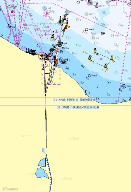 推荐在经过 31.3° N 经线时开始换油,油品应在经过此经线后恢复为高硫油。