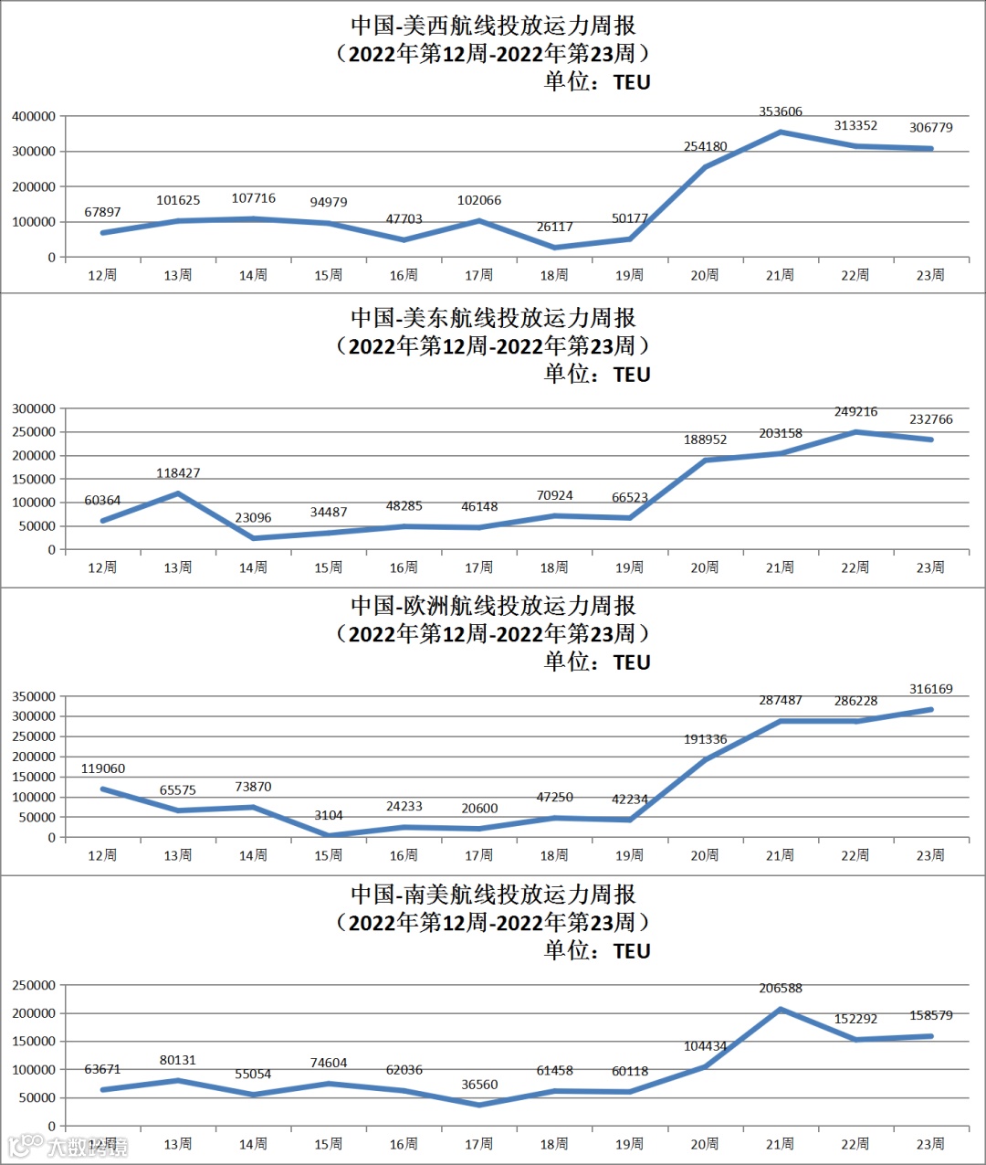 进入5月,从19周开始,中国-美西、中国-美东、中国-欧洲和中国-南美航线的运力投放开始逐渐上升。