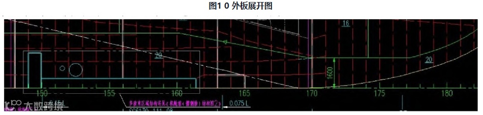 (4)在多波束周围及其前部区域,船底外板整体采用厚20 mm的钢板,避免由于板厚差异带来的外板不平整。并且,此区域中还要对接焊缝打磨平整,避免产生气泡。外板展开图见图10,其中L为船长。