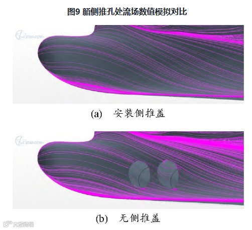 (3)在艏部的侧推开口增设液压侧推盖板,避免在船舶航行时侧推管隧两侧产生气泡,降低对多波束的影响。艏侧推的管隧开口会导致艏部船体外壳不光顺,使湍流产生大量气泡且被推进船壳下,最后混合入边界水层,这最有可能为换能器带来气泡问题。只能在船舶设计期间解决这一问题,通过CFD模拟分析海水流场,设计合理的艏部线型(包括光顺侧推管隧口),选择声学换能器合理的安装位置和安装型式来避免气泡和噪声对声学设备的影响。目前仍无任何技术手段能量化侧推盖板对声学探测设备的改善效果,但可以确定的是,艏部侧推封盖的安装可有效改善船体外板的光顺度,有效改善气泡流场,见图9.