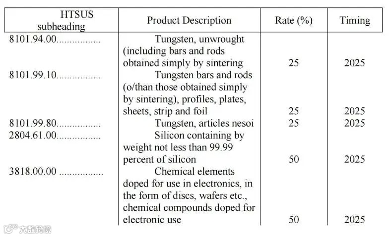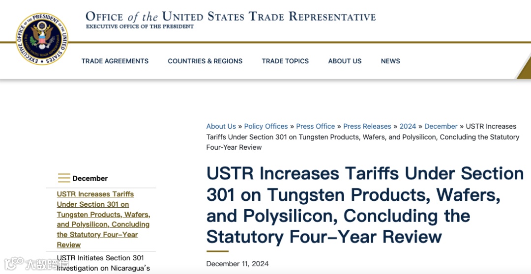 美国时间12月11日,据美国贸易代表办公室官方消息,美国将依据《1974年贸易法》第301条款,对中国出口的某些钨产品、晶圆以及多晶硅征收高额关税。具体而言,太阳能矽晶圆和多晶硅的税率将提高至50%,钨产品的税率则提高至25%。这些关税措施将于2025年1月1日正式生效。