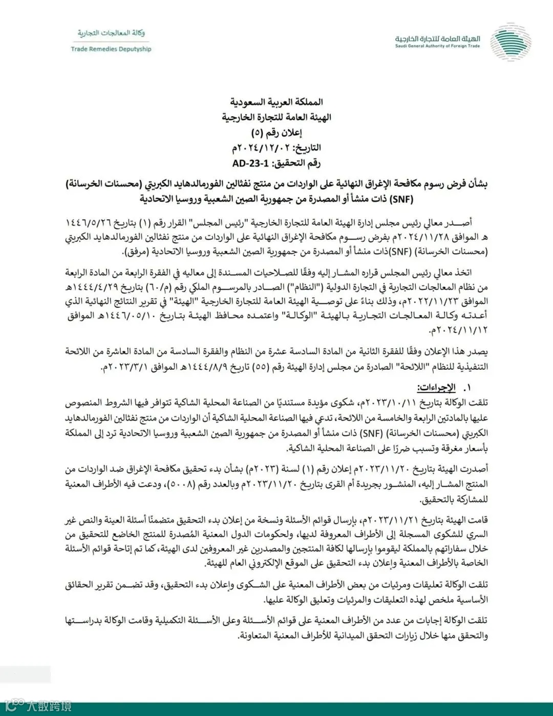 另外,值得一提的是,沙特阿拉伯近日也宣布将对原产于或出口自中国和俄罗斯的进口磺化萘甲醛(SNF)(混凝土改进剂)征收反倾销税。具体而言,沙特将从2024年12月3日起对这类产品征收18.12%至34%的最终反倾销税,有效期为五年。这一决定由沙特商务部长兼对外贸易总局主席Majed Al-Qasabi宣布并刊登在官方公报上。