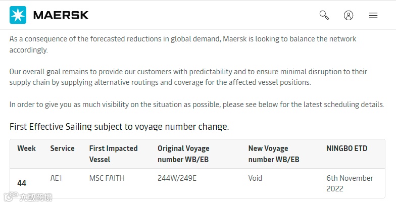 2M联盟的合作伙伴MSC和马士基日前宣布,由于“预计需求的减少”,他们将再次取消从中国首航的AE1/Shogun亚洲-北欧航次,即取消原定于11月6日从宁波港启航的14336标准箱“MSC Faith”轮。
