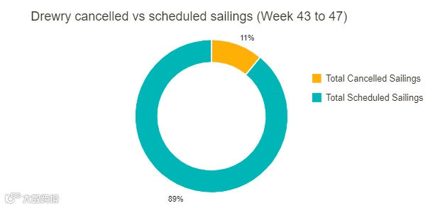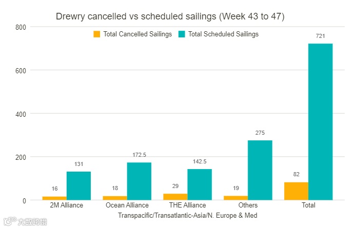 此外,德鲁里最新取消航次追踪数据显示,在跨太平洋、亚洲至北欧和地中海等主要航线上,在第43周和第47周期间,721个预定航次中有82个航次被取消,取消率为11%。