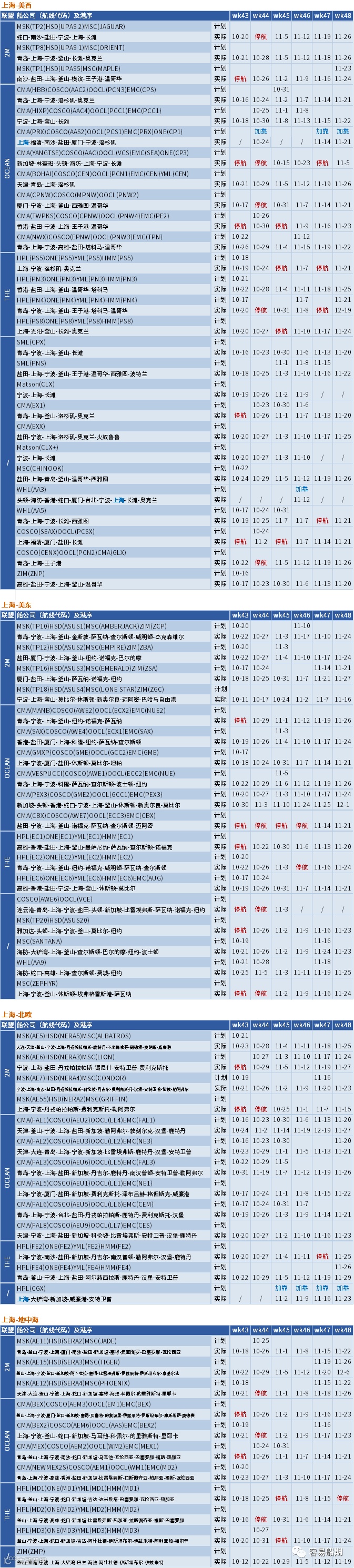 以下是容易船期统计的从中国出发到北美、欧洲和地中海第43周-第48周的停航跳港汇总(上下滑动查看):