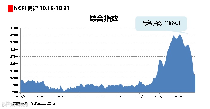 宁波航运交易所发布的宁波出口集装箱运价指数(NCFI)报收于1369.3点,较上周下跌2.1%,21条航线中有14条航线运价指数下跌。