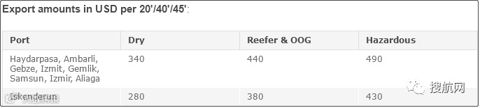 出口货物适用的港口包括哈达帕萨港(Haydarpasa)、阿姆巴利港(Ambarli)、盖布泽港(Gebze)、伊兹米特港(Izmit)、盖姆利克港(Gemlik)、萨姆松港(Samsun)、伊兹密尔港(Izmir)、阿利亚加港(Aliaga)和伊斯肯德伦港(Iskenderun),对应的码头操作费如下: