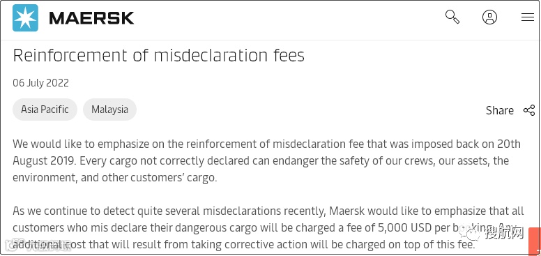 7月6日,马士基发布关于加强误报费(misdeclaration fees)的通知,通知表示,由于最近发现不少误报,因此在此强调,对于所有误报危险货物的行为,每次将收取5000美元的误报费,因采取纠正措施而产生的任何额外费用将在该费用的基础上收取。
