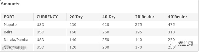 适用于马普托港(Maputo)、贝拉港(Beira)、纳卡拉港(Nacala)、彭巴港(Pemba)和克利马内港(Quelimane)以及干箱和冷藏箱进出口货物。对应港口收取的费用如下: