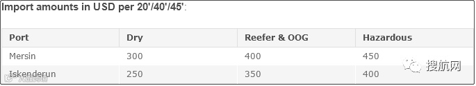 进口货物适用的港口包括梅尔辛港(Mersin)、伊斯肯德伦港(Iskenderun),对应的码头操作费如下:
