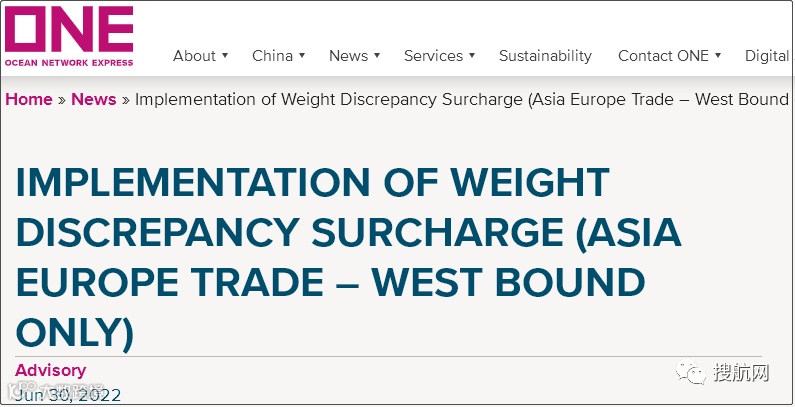 6月30日,ONE发布通知称,自2022年7月1日(订舱接收日)起,对误报的每个集装箱征收2000美元的重量差异附加费(WDS),适用于亚欧西行航线。