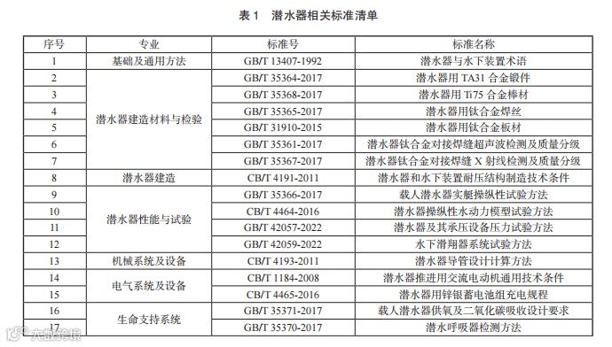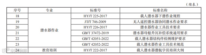 目前,潜水器相关国内标准共 24 项,主要聚焦于潜水器术语等基础通用领域,材料选用、建造质量控制等材料及检验领域,耐压结构建造等建造领域,操纵性、系统试验等性能试验领域,推进、电气系统设备等系统设备领域,协同作业、作业规程等作业领域,人员培训、作业大纲等培训领域(见表 1),解决潜水器关键共性技术的配套支撑标准尚存空白,建议结合我国潜水器技术发展需要,进一步建立健全潜水器标准体系,完善配套支撑标准。