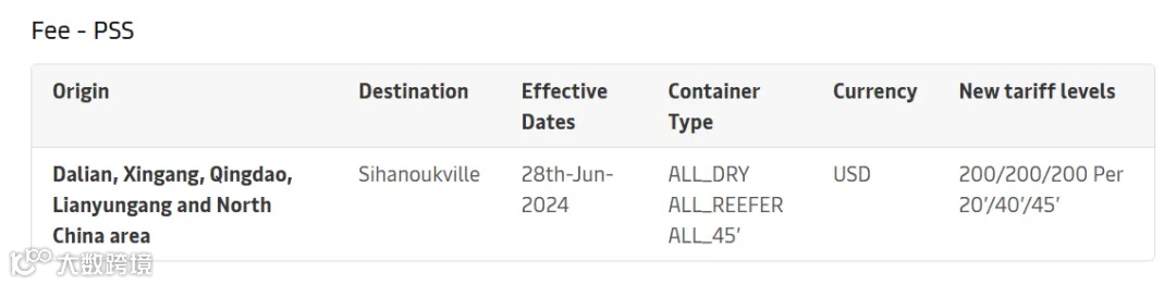 同日,马士基还宣布自2024年6月28日起,对从大连、新港、青岛、连云港及华北地区至西哈努克的干货集装箱和冷藏集装箱实施旺季附加费(PSS)。详情如下:
