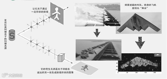兰德公司(RAND Corporation)物理学家Edward Parker在他2021年10月的一份报告“量子技术的商业和军事应用及其时间表”(“Commercial and military applications and timelines for quantum technology”)中写道:量子传感的另一个应用是“鬼”成像(ghost imaging)技术,利用光的独特特性和非常微弱的照明光束来探测远程的物体(译注:“鬼”成像又称双光子成像(two-photon imaging)或关联成像(correlated imaging),是一种利用双光子复合探测恢复待测物体空间信息的新型成像技术。可让一台高分辨率照相机对一个它本身并不能看到的物体成像,方法是使用2个传感器,一个对着光源,另一个对着这一物体,利用光子纠缠的特性进行成像。这些光束不但非常难以探测且适合隐蔽作战,也能实现在最低光照条件下的成像。它们能穿透主要大气遮蔽物,如浓烟或云。