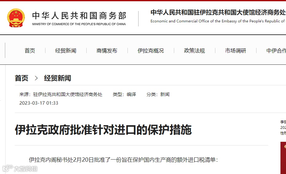 日前,据中国驻伊拉克共和国大使馆经济商务处消息,2月20日,伊拉克内阁秘书处批准了一份旨在保护国内生产商的额外进口税清单: