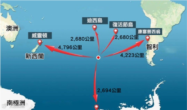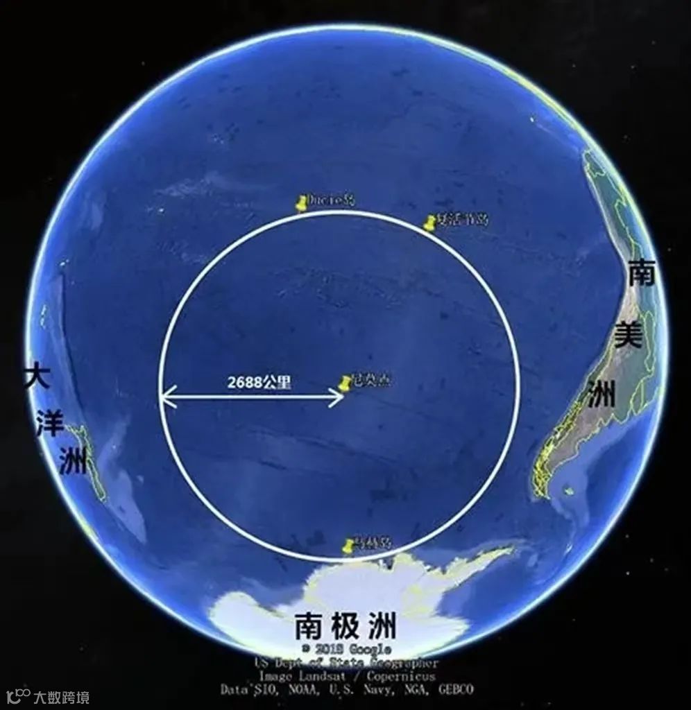 这三座岛屿中,距离尼莫点最近的是迪西岛,但是也足足相距2688千米。当我们以尼莫岛为圆心,以2688千米为半径画一个圆,那么这个圆形区域的大小将堪比整个北美洲。