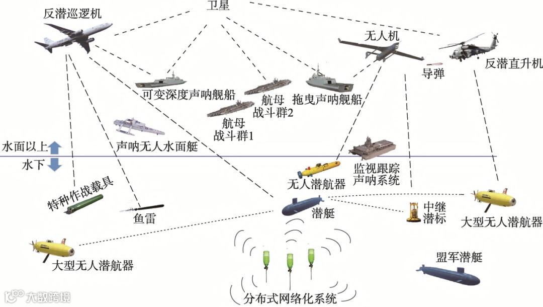 在今后的海上联合作战中,无人系统支持下的联合战术跨域协同,见图7,必然要和天基、岸基、空中、水面、水下多类型有人/无人平台合作实施预警探测,态势共享、火力打击以及其他各种作战任务,需要经常和其他节点进行通信连接,同时兼顾体积,功耗等因素、在布局和其他要素的情况下集成水声和光学、电磁和其他各种通信手段,实现与其他作战平台/作战系统之间的有效信息通联。