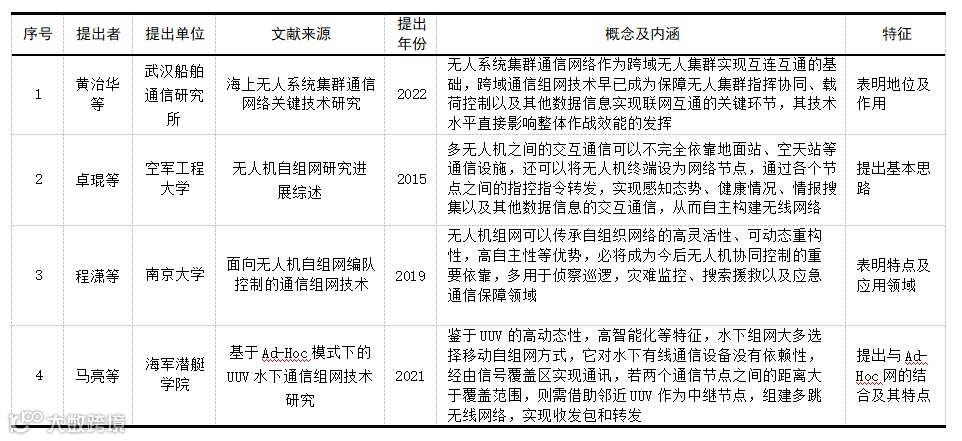 无人集群实现通信主要依靠无线自组网(如“Ad-Hoc”),目前国内学者对于集群通信组网尚未形成成熟完备、高度统一的认识[6]。集群通信组网可依据应用领域不同,将其划分为指挥控制组网、平台决策组网、导航基准组网等,通过查阅近年来集群通信领域文献资料和研究成果,对集群通信组网概念及内涵的相关描述进行了梳理归纳,如表1所示。