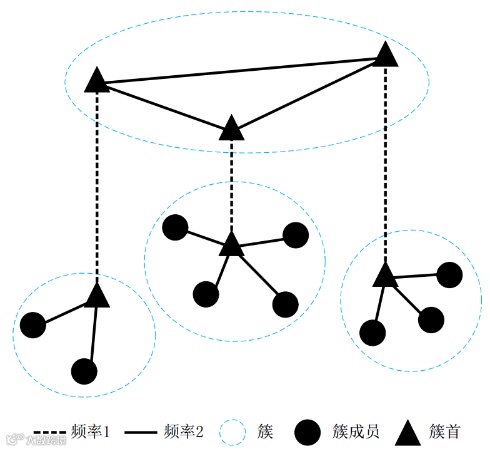 3)多频分级结构。在多频分级结构,如图3所示,网络进一步被划分为多层级或簇,属于同一层级或者簇的节点之间采用同一通信频率,在不同的层级或者簇的节点之间又采用不同通信频率。高层级节点可访问不同级别,使节点通信可以采用多种频率来实现,进而完成数据发送与转发。多频分级结构能进一步减少节点扰动,提高传输效率,但要占用更多频宽资源,不适合频宽资源短缺的网络系统。