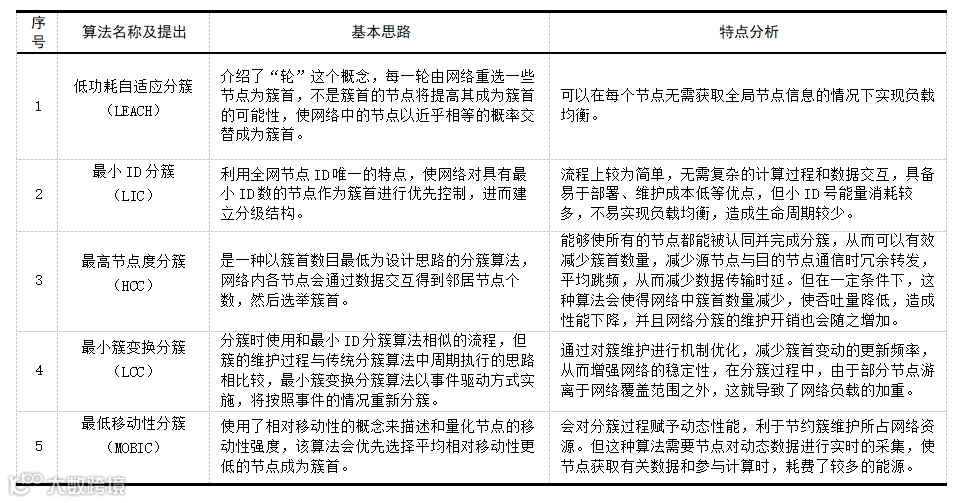 过于繁杂的拓扑结构将导致节点之间数据传输发生碰撞或冲突,造成全网数据传输效率和吞吐量的骤减,而过于简单稀疏将会减少可行链路数量,造成孤立节点或者割裂网络的出现,致使网络稳定性降低。为解决这类问题,引入前文提到的分簇算法来优化拓扑结构。分簇算法又称为层次型拓扑控制算法,其主要概念和理论由BAKER等在1981年提出,主要内容是通过选举簇首、簇成员对网络等级进行划分,使簇首成为汇聚和转发的主要节点[20]。分簇算法的最大优点在于能够使得网络冗余降低,有助于增强网络功耗,实现负载均衡控制,从而提高网络寿命,自提出以来一直成为无线自组网领域的研究热点。本文简要介绍几种常见的分簇算法,并逐一分析其特点,如表3所示[21-25]。