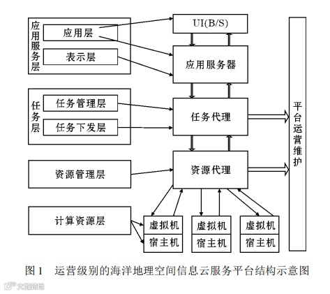运营级别的海洋地理空间信息云服务平台可以部署在网络环境的任意位置,运营级别的海洋地理空间信息云服务平台结构如图1所示。在海洋经济建设、海洋资源管理与海洋权益维护领域广泛的应用,涉及规划、海警、海事、国土、气象、环保、统计、公众服务等很多部门。