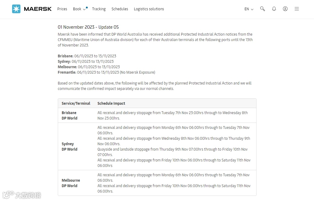 11月1日,马士基官网更新了DP World Australia劳工行动的预警。